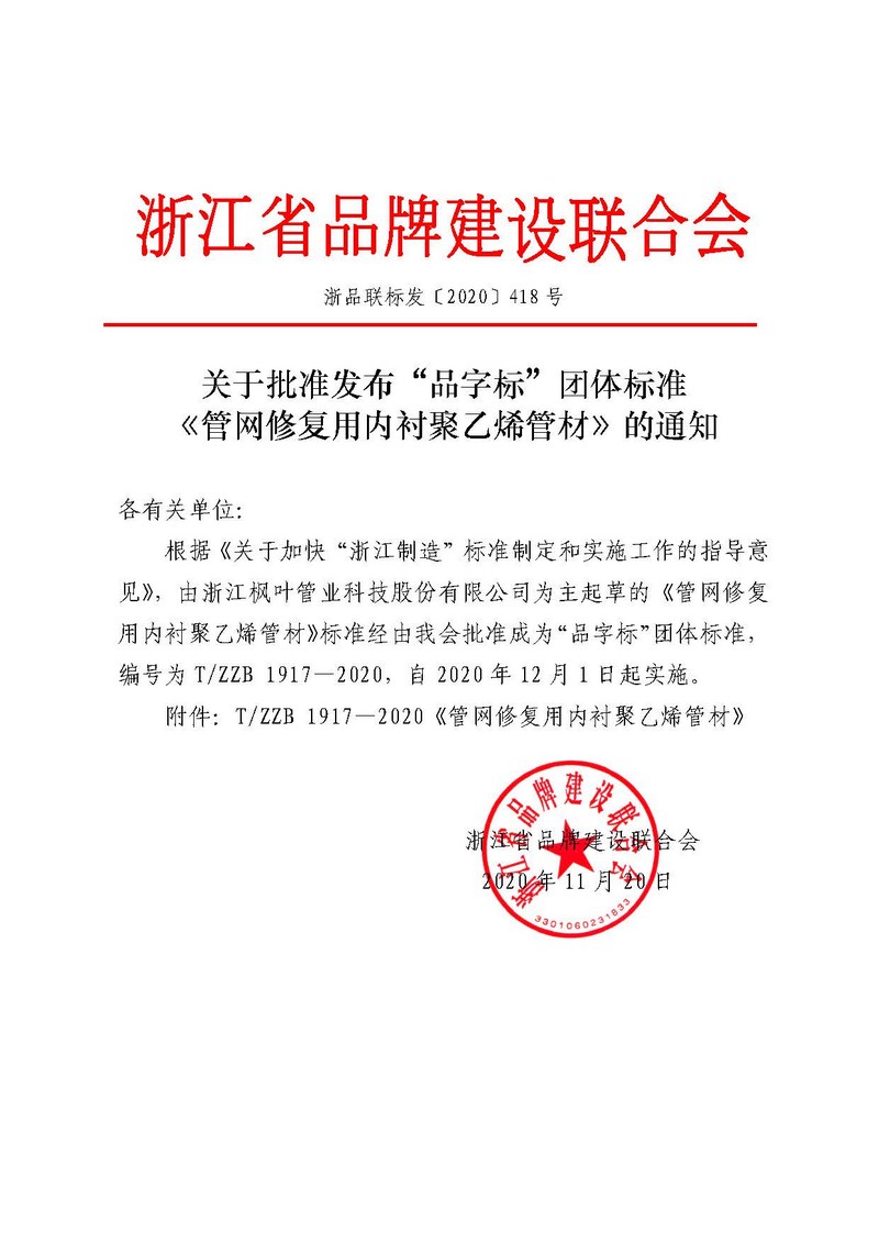 2020年11月20日,由浙(zhè)江青青草免费在线观看视频管業科技股份有限公司為主起草的《管網(wǎng)修複用內襯聚乙烯管材》標準,經由浙江省品(pǐn)牌建設聯合會批準成為“品字標”團體標準,並自2020年12月1日起正式實施。